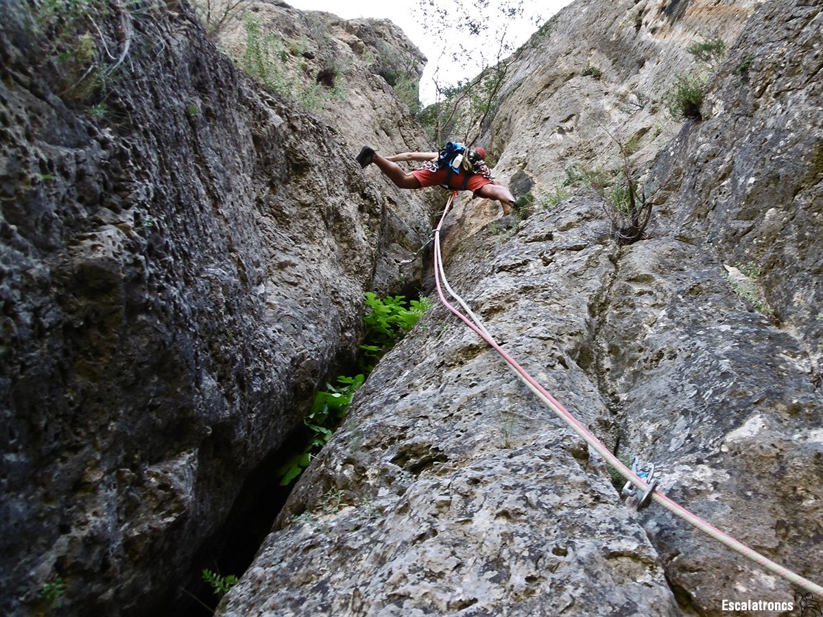 Des de la R-3 un ràpel fins al coll i d’allà un altre de 55 pel vessant sud fins al terra.