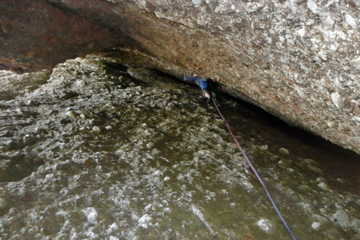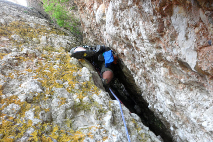 La tercera tirada no es queda curta per espectacular. Primer continuem per l’escletxa fins que un sostre ens barra el pas; aleshores toca sortir cap a fora amb un ambient sensacional (el pas clau és protegit amb un espit). La reunió la farem en un arbre dins la canal.