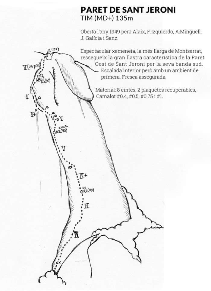 I si la xemeneia és digna d’admirar els TIM no es quedaven enrere. Decidits a conquerir totes les grans parets, van afrontar el repte d’escalar el vessant oest de la Paret de Sant Jeroni per on intuïen que seria menys complicat, descartant l’altra banda de la llastra perquè imaginaren que el sostre somital els hi donaria massa problemes, cosa que un any després la cordada Torras-Nubiola va comprovar que no era així. Per obrir la via van necessitar 4 atacs i totes les estratagemes que tenien a l’abast incloent-hi l’ús del famós “cric”.