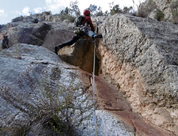 Des del cim marxem cap al nord per de seguida virar cap al sud passant per la feixa que separa la tercera i la quart tirada. Creuem i anem a buscar una canal que ens mena a una nova feixa des de la qual arribem a la segona reunió. Des d’aquí fem un ràpel de 50 fins al terra.