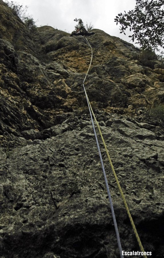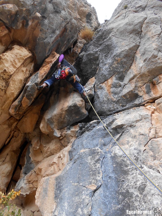 Tots els llargs són bons. El primer té un inici ben bonic, amb una part central una mica bruta i un final en fissura. El segon es troba pràcticament equipat, tot i que podrem posar un tascó petit entre el segon i el tercer parabolt. La tercera tirada té un primer tram de roca deplorable, però ben assegurat. Un cop superat ens queden 20 metres de diversió amb un seguit de fissures genials. La darrera tirada aprofita el darrer pany escalable i encar hi trobarem algun pas divertit. No us deixeu els tascons!!