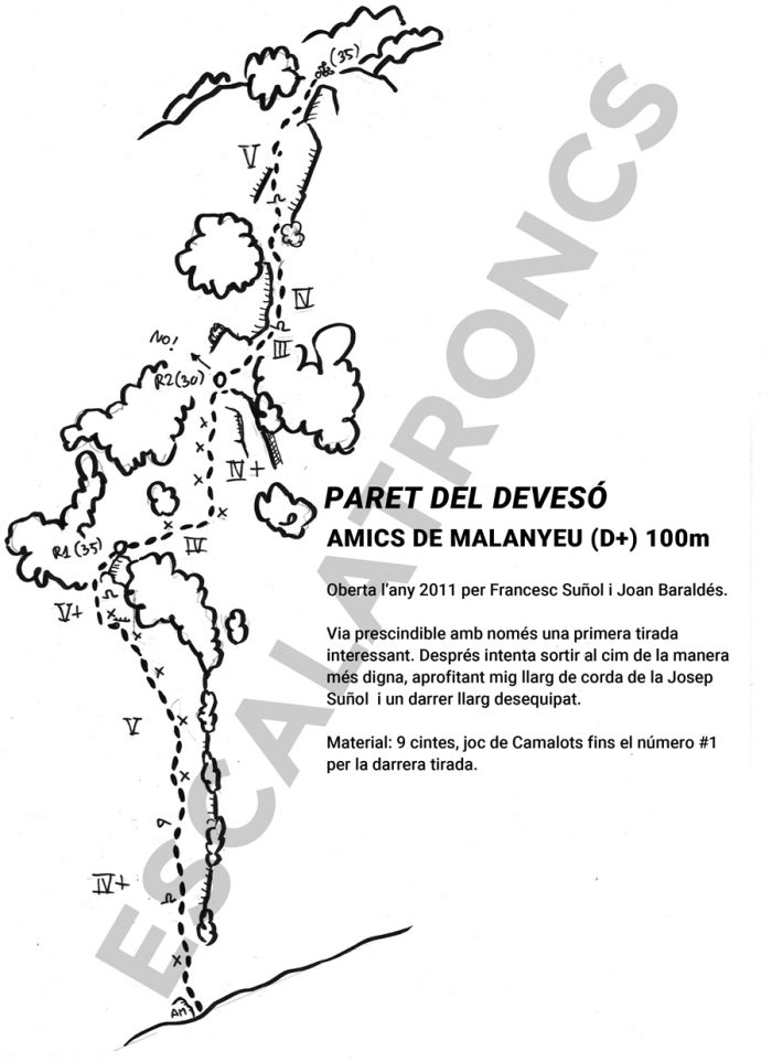 El peu de via té marcades les inicials AM. La primera tirada s’enfila per una típica placa de la zona, tot i que trobarem algun punt on la roca no és del tot bona.