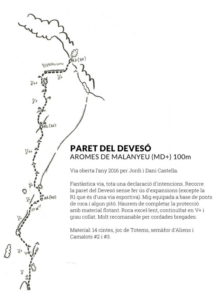 Desmarcant-se de la tendència imperant a la zona l’Aromes de Malanyeu proposa una altra manera d’enfilar-se a la paret, més sincera, més autèntica. La via, tota una declaració d’intencions, aprofita les possibilitats del pany i brinda l’oportunitat d’entrar en el joc de l’auto protecció. Que diferent seria el sector i s’hagués estat més honest i s’obrís pensant en el que realment aporten les vies al col·lectiu i no tant en què aporten al propi ego.