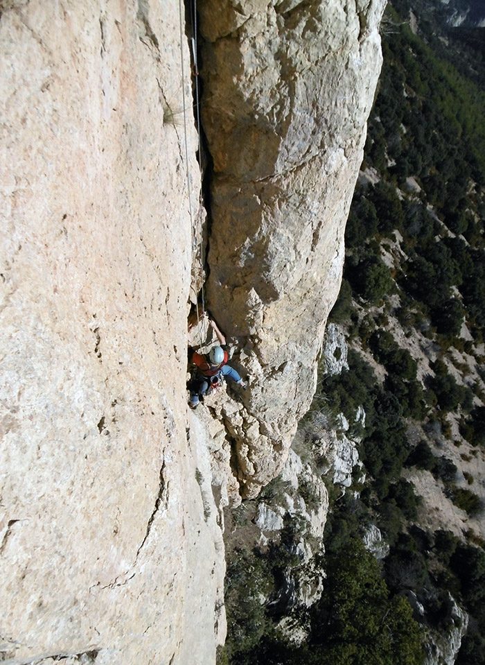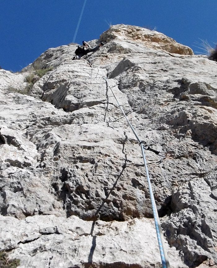 La part més compromesa la trobarem a l’inici cel cinquè llarg de corda, on la protecció es fa difícil abans de caçar l’únic clau de la tirada que protegeix el pas de 6a+.