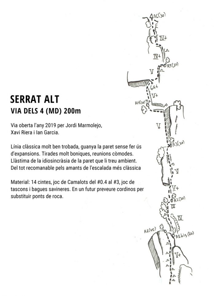 - Material: 14 cintes, joc de Camalots del #0.4 al #3, joc de tascons i bagues savineres. En un futur preveure cordinos per substituir ponts de roca