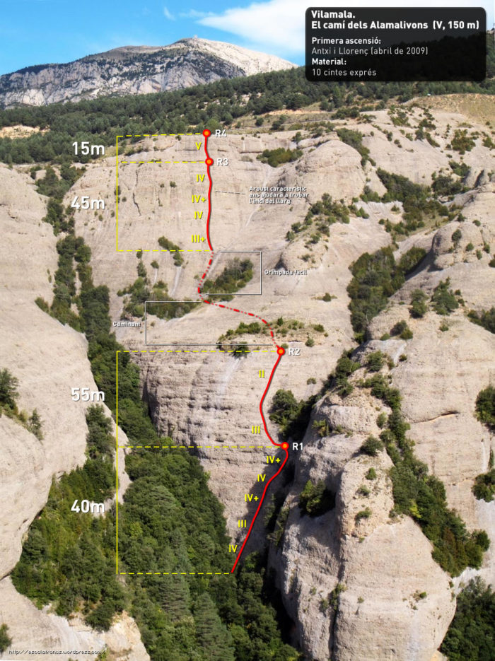 Aquesta via, oberta l’abril de 2009 per l’Antxi i en Llorenç, ens permet descobrir un dels racons més desconeguts del Solsonès: Vilamala. El conglomerat no és de la millor qualitat, però sí que és més bo del que podíem pensar d’entrada. La via és divideix en dues parts, una primera, una mica més descomposta, que ens deixa a una mena d’esplanada a mitja via i una segona, on la roca millora, que ens permet sortir de la paret per dalt. Tot i que la continuïtat es veu trencada per aquest replà la via és una bona excusa per deixar-se caure per aquest racó tant poc conegut de la nostra geografia.