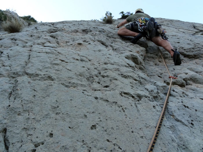 La via es composa de dues tirades, la primera més difícil, sobretot pel desencertat emplaçament de les assegurances. El segon llarg per contra, transcorre per plaques compactes molt agradables d’escalar. Pel primer llarg podem portar alguna baga savinera que servirà per no tocar el terra si fallem abans del primer bolt.