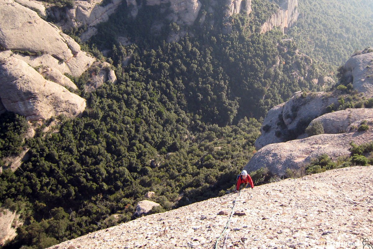 Sortim de la reunió cap a l’esquerra, la primera assegurança és convenient xapar-la amb una cinta llarga, donat que després seguim recta amunt i la corda pot fregar bastant. Un cop superada la sortida (IV+) la resta del llarg no presenta més dificultats (IV i III). 45 metres.