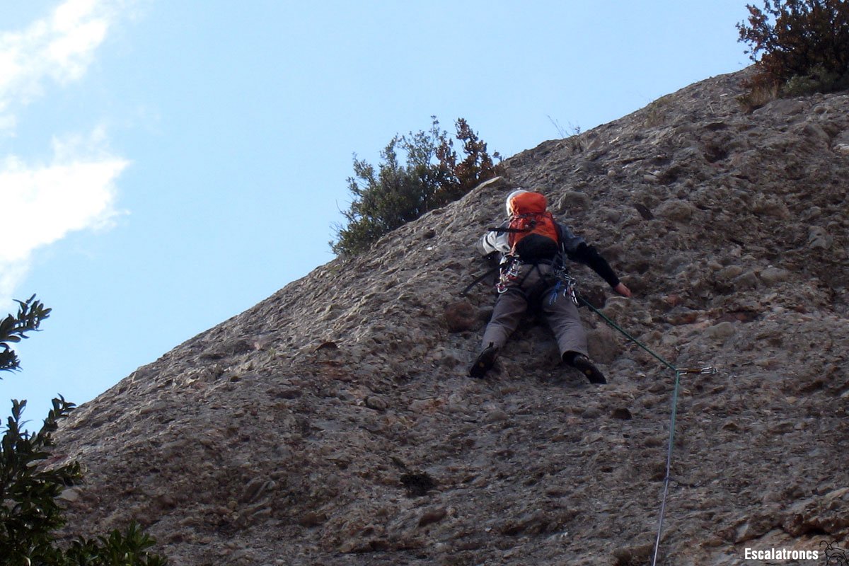 Es surt recte amunt i és qüestió d’anar seguint els parabolts. Aquest llarg és una placa boníssima i surt un llarg de V força maco, amb continuïtat i bones presses. 35 metres.