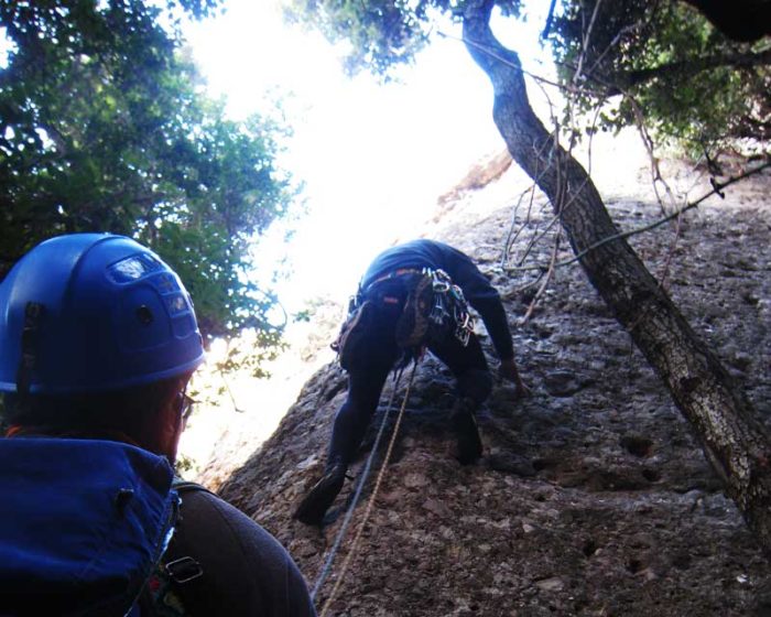 Un ràpel de 40 metres fins a la r2 i un altre de 50 fins al peu de via.
