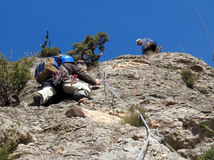La darrera tirada comença tombada, hem d’anar amunt fins a trobar un ressalt més vertical, però ben protegit amb un clau. Un cop superat anem en diagonal a l’esquerra fins arribar a un pi on fem l’última reunió. 40 metres.