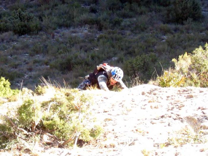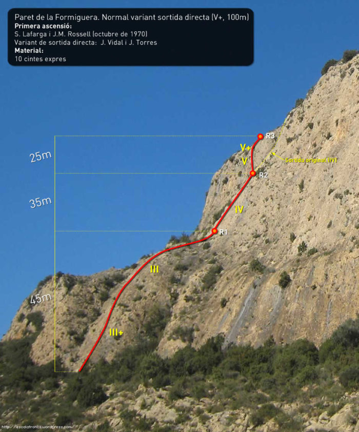 La via comença al centre d’un ample esperó fàcilment identificable a la part esquerra de la paret. Hem d’escalar pel centre per terreny tombat fins arribar a la primera reunió. 4 espits i 45 metres.