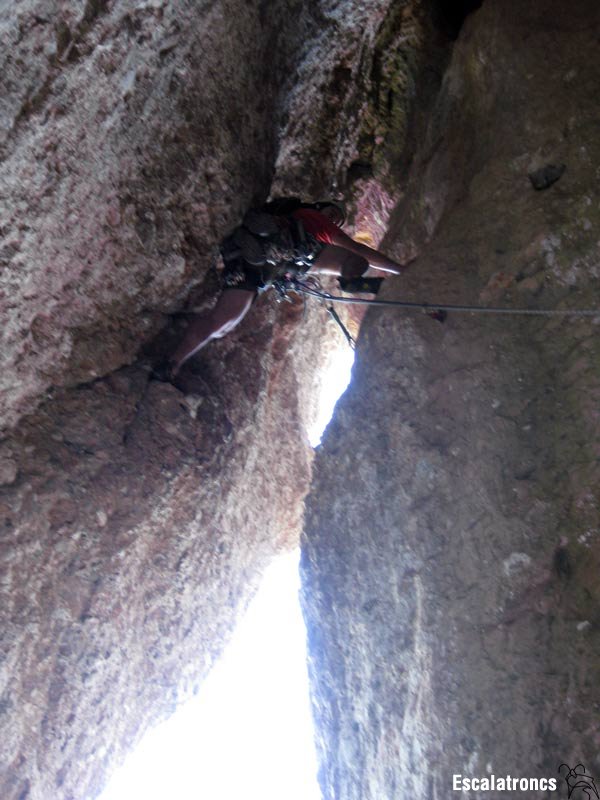 La via s’inicia a l’interior d’una cova. Ens enfilem per la paret fins que hem de fer un petit flaqueig a l’esquerra. En un moment quedem sobre una petita lleixa. Seguim cap a l’esquerra fins arribar a una petita canaleta que escalem en diedre per després flanquejar de nou a l’esquerra i sortir de la cova. A partir d’aquest punt escalem en artificial fins que puguem tornar a sortir en lliure. Seguim pel costat d’una fissura i després en diagonal cap a la dreta fins a la reunió. 35 metres