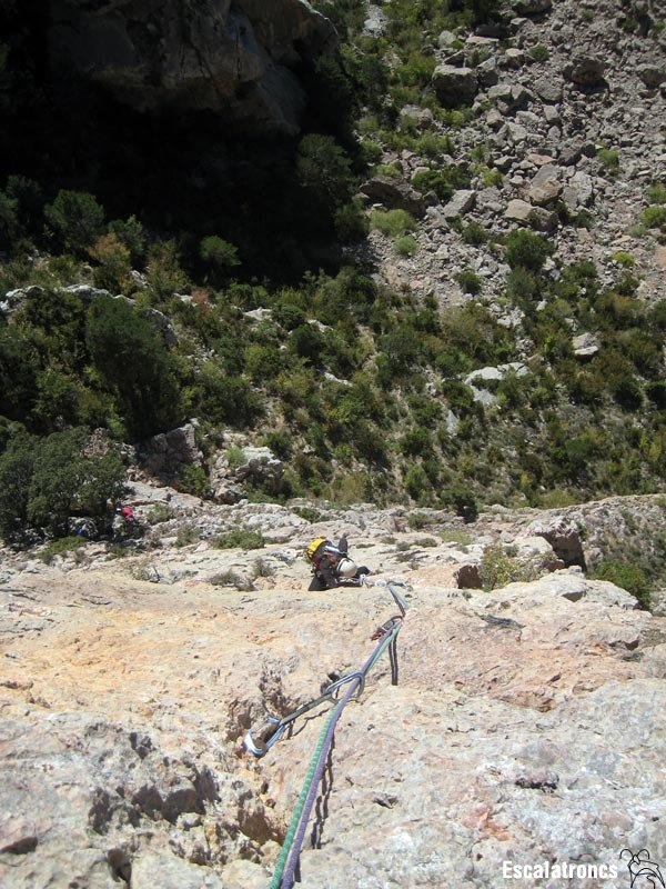 Llarg molt curt però maco de fer. Sortim de la reunió cap a l’esquerra i superem una sèrie de ressalts. Seguim cap una mena de llastra encastada. Aquí extraploma un xic, però de nou les preses són d’escàndol. Ens superem i escalem uns últims metres en diedre. 15 metres.