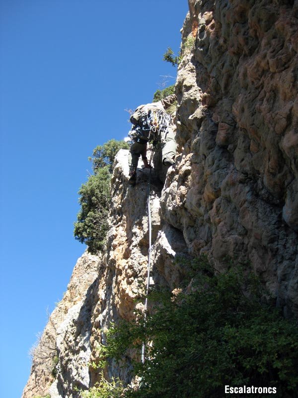 Iniciem el descens cap al sud-est, seguint un corriol poc fressat. Continuarem una estona fins trobar una alzina amb vagues i un mallon. Fem un primer ràpel curt que ens deixa a una segona alzina des d’on farem un darrer ràpel fins al terra. Seguim un corriol cap a l’oest que ens portarà cap a la tartera i el vehicle.