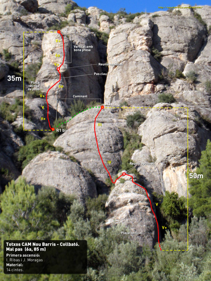 La via s’inicia a la dreta de la Somni de Primavera, just per la part més vertical del ressalt. Els primers metres són un petit mur vertical on anirem trobant forats i haurem de col·locar-nos bé. Sortint de la part més vertical superarem un darrer ressalt amb roca un xic dubtosa. Un cop passat la dificultat minva de cop. Trobem una primera reunió, però val la pena seguir fins la següent, ja que la resta de la tirada és una rampa sense dificultat i si posem una cinta llarga a la reunió no hi haurà problemes de fregament. 50 metres.