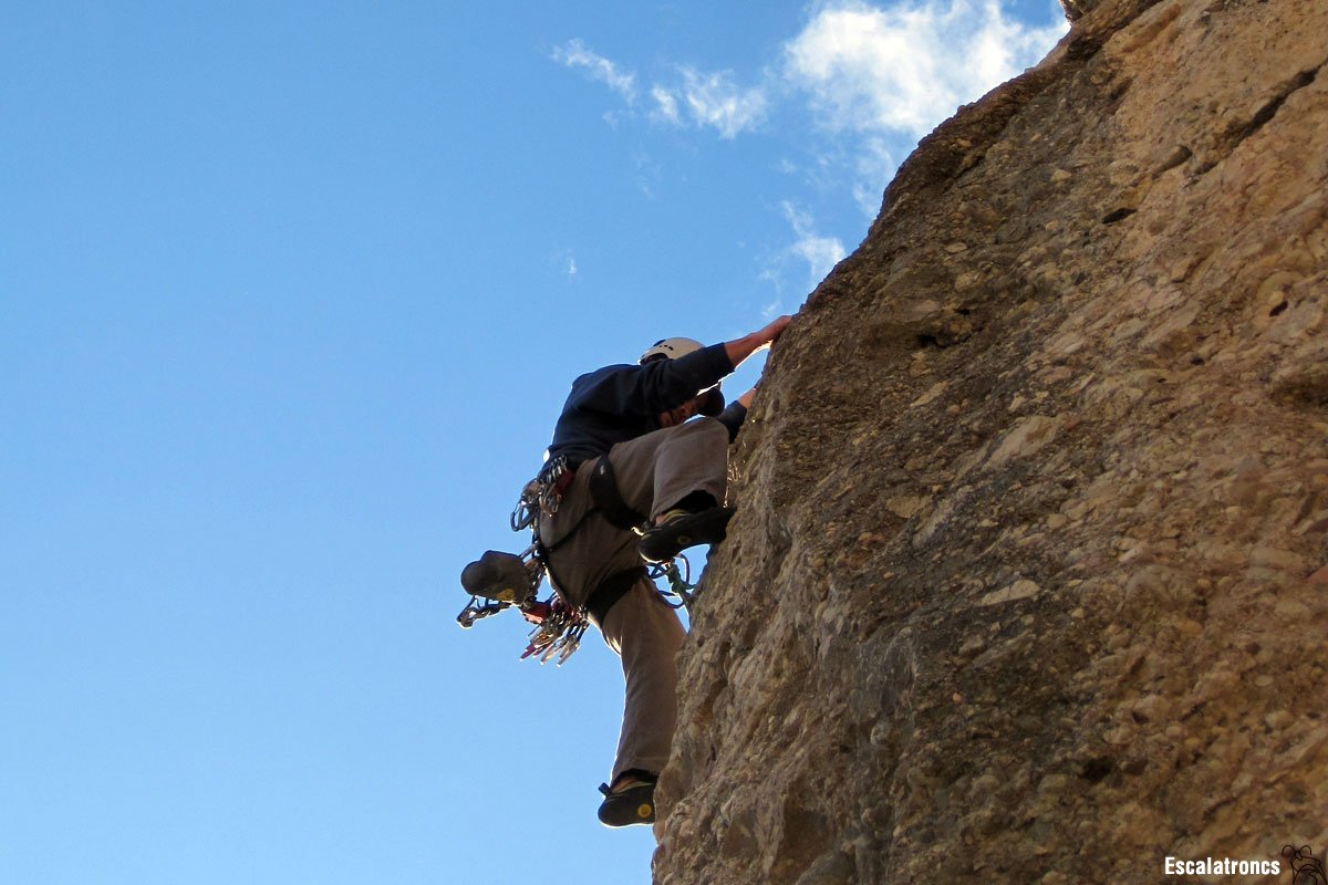 Anem caminant cap a l’esquerra i descendim uns metres fins una nova reunió al peu d’un altre mur vertical, de característiques molt semblants al de l’inici del llarg anterior. Després d’uns primers passos més fins, haurem de començar a anar en tendència a la dreta fins situar-nos davant un nou mur, ara una mica inclinat. Per pujar-hi haurem de cercar la millor posició pels peus donat que les preses per aquests són un xic escadusseres. Un cop sobre la placa anirem flanquejant cap a la dreta per sota el desplom, per acabar d’evitar-lo sortint pel fil de l’esperó. El moviment és atlètic, però trobarem un forat boníssim per la ma dreta a l’altre costat de l’esperó que ens facilita molt les coses. Continuem fins una reunió intermitja. Ara només resta un darrer tram, vertical i amb presa generosa.