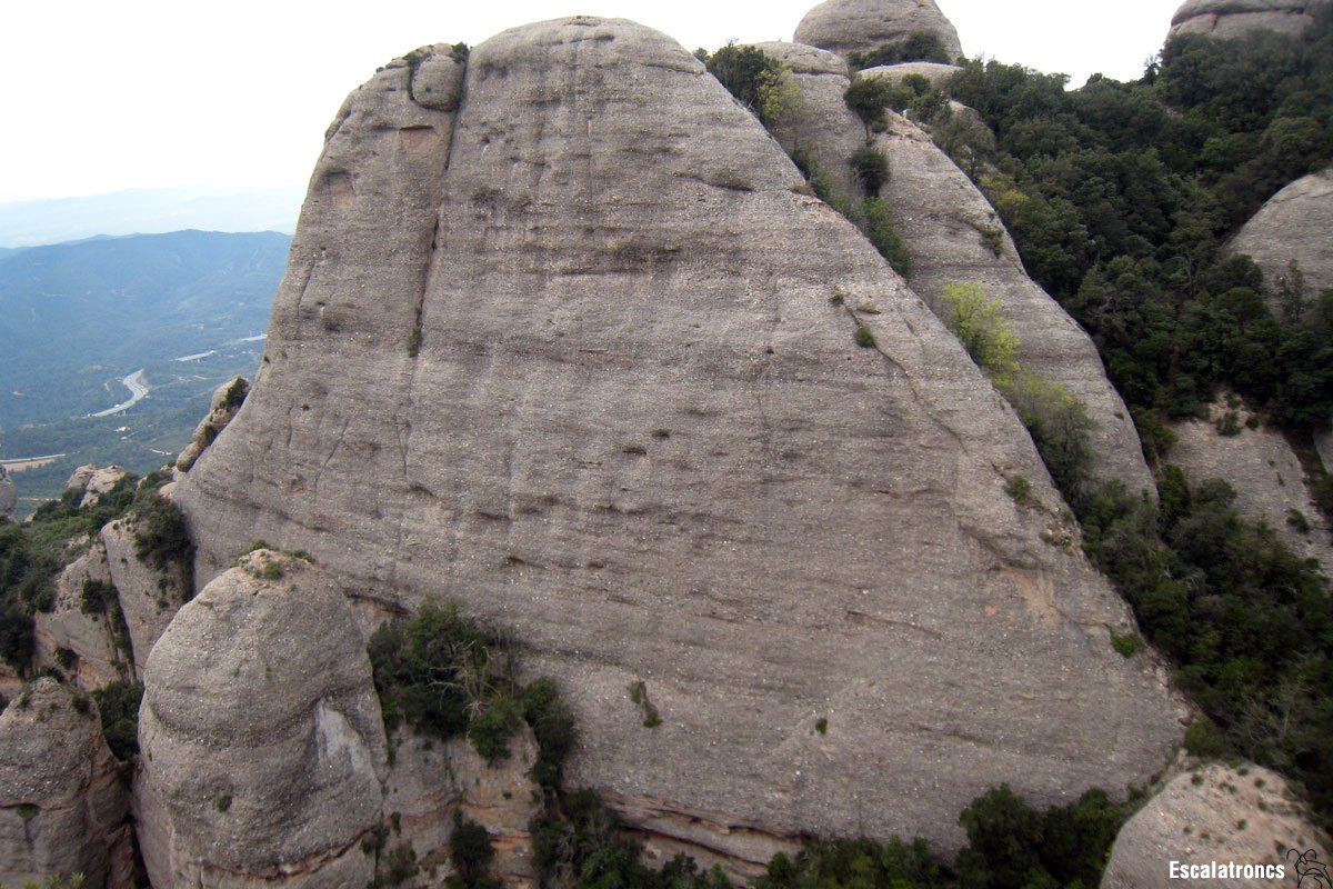 La via s’inicia a la part més alta del coll que formen la Miranda i les Momietes. Sortim recte amunt a buscar la primera expansió que es troba a uns cinc metres del terra. De seguida es posa vertical, però trobem les preses justes per no patir. Hi ha un curt tram on les preses no són tant evidents (V+), un cop superat la verticalitat minva i aleshores hem de començar a escalar en diagonal a l’esquerra. Trobarem una primera reunió que no muntarem però que podem aprofitar per assegurar el flanqueig. Seguim flanquejant uns pocs metres fins que entrem a una balma on farem la primera reunió. 30 metres.