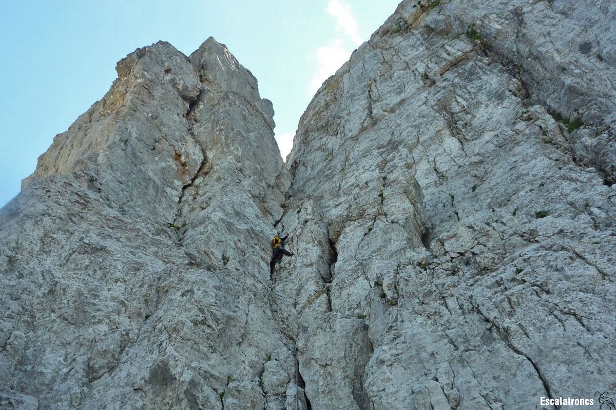 En aquesta tirada hi ha diferents versions depenent de la ressenya que duem. Nosaltres hem optat per flanquejar uns metres cap a l’esquerra per una vira i pujar recte amunt per una sèrie de ressalts que ens menen a una xemeneia. Sortir de la xemeneia cap a l’esquerra requereix un pas força atlètic i de decisió, més quan aquesta és difícil de protegir i només un clau uns metres més avall protegeix la jugada. Un cop fora seguim uns metres en diagonal a l’esquerra i trobem un espit on muntem la reunió. 30 metres.