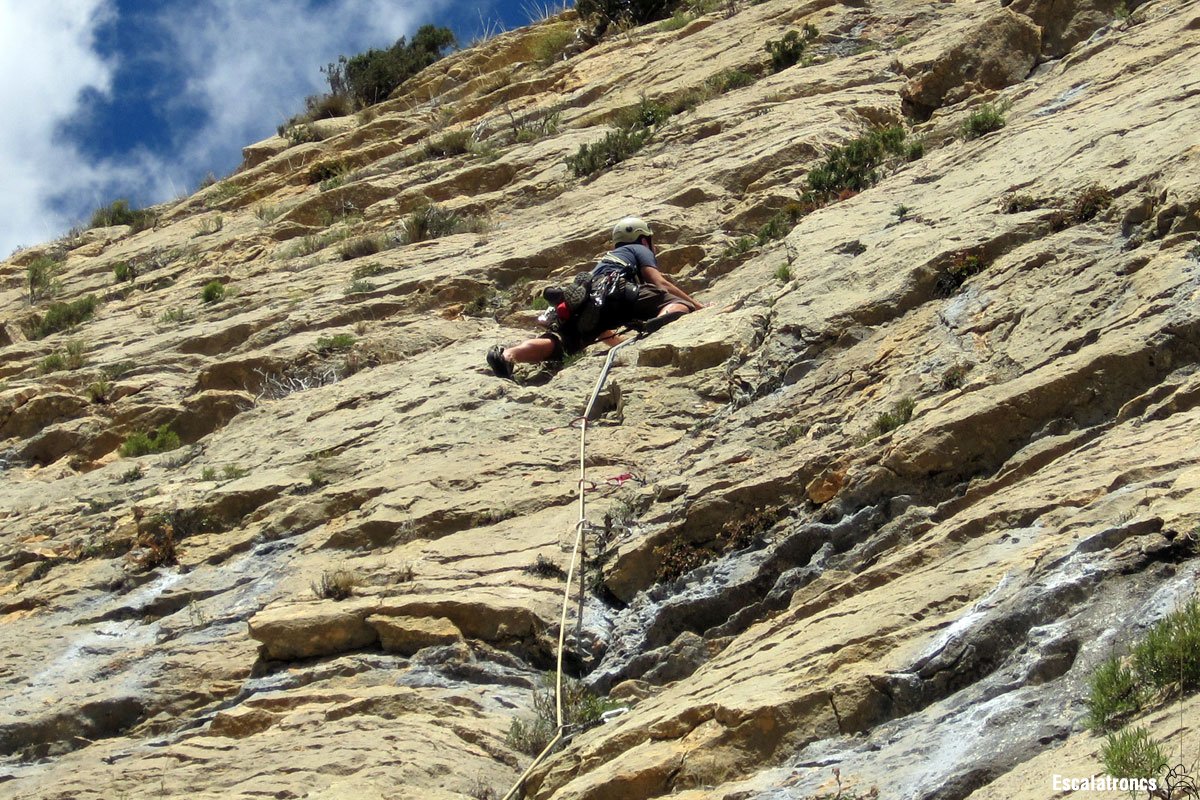 Sortim de la reunió per la placa en diagonal a la dreta per després d’haver xapat la primera expansió tornar cap a l’esquerra fins una llastra bastant precària que millor no tocar (és molt grossa i està sobre la reunió). Seguim amunt per la placa fins que ens enfilem a una petita lleixa. Tenim un parell de passos d’Ae amb una sortida maca i atlètica sobre una nova feixa. Si volem fer-ho en lliure anirem per la dreta dels parabolts, aprop del fil de l’esperó, on anirem trobant regletes fins atènyer les generoses nanses que ens permeten posar-nos sobre la feixa. Des d’aquest punt sortim en tendència a l’esquerra, evolucionant per terreny senzill i un xic indefinit fins la següent reunió, molt còmoda. 30 metres.