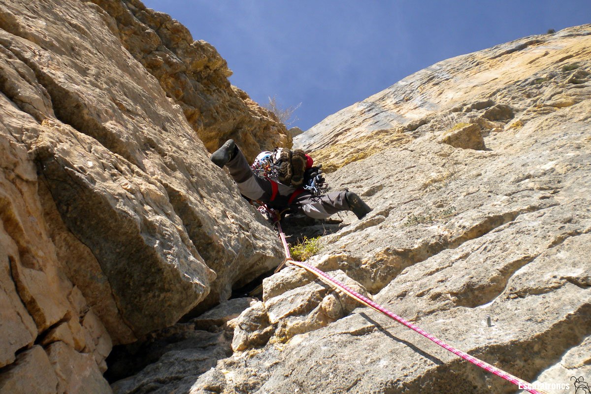 Sortim de la reunió flanquejant un parell de metres i enfilem una panxeta amb molta ganda. Un cop superada continuem per terreny fissurat que ens permet assegurar-nos a discreció. Un cop passat aquest primer tram més vertical trobarem un parell d’espits sense placa (possible reunió) on hi entra una plaqueta recuperable. Seguim amunt en direcció a una savina característica que ja es troba a l’inici del diedre. Abans d’arribar-hi haurem de superar un nou tram vertical, però de nou amb molt bona presa. Fem la reunió a la savina. 20 metres, un cap d’espit.