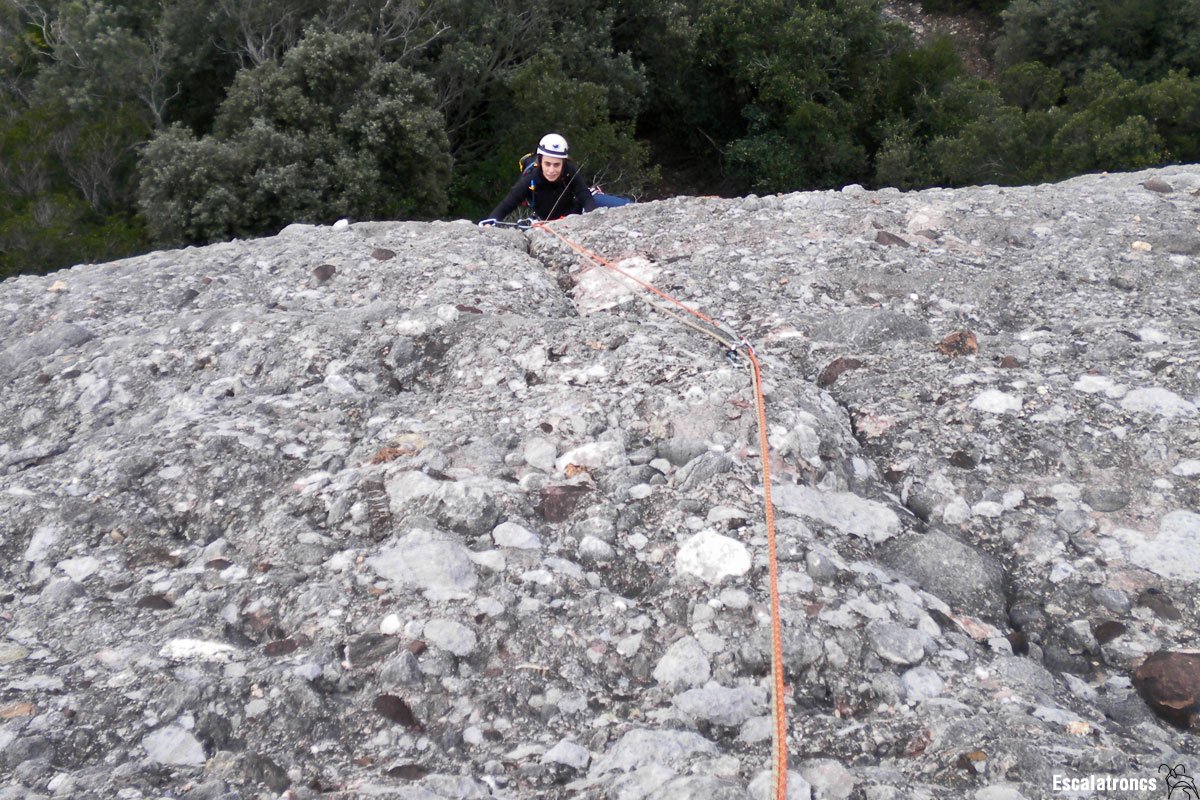 Trobar el peu de via és fàcil donat que el primer llarg ressegueix una evident fissura fàcil d’identificar. Aquesta primera tirada té uns primers metres força mantinguts i tècnics de 6a (potser més del que sembla d’entrada). Un cop arribem a un pont de roca la pedra canvia completament, tornant-se cantelluda, mentre l’escalada va perdent verticalitat fins arribar a la reunió. 30 metres.