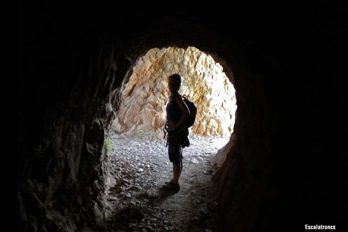 Caminem per la feixa cap a l’esquerra (nord) i entrem a un túnel. Baixem amb cura ajudats per unes estaques metàl·liques. Arribats a una bifurcació prenem el camí de l’esquerra, que en pocs metres ens mena a una nova bifurcació, de nou prenem l’esquerra i en pocs metres arribem a l’exterior. Muntem un ràpel que ens deixa a l’estrem dret de la presa, tot just per on abans hem saltat la tanca.