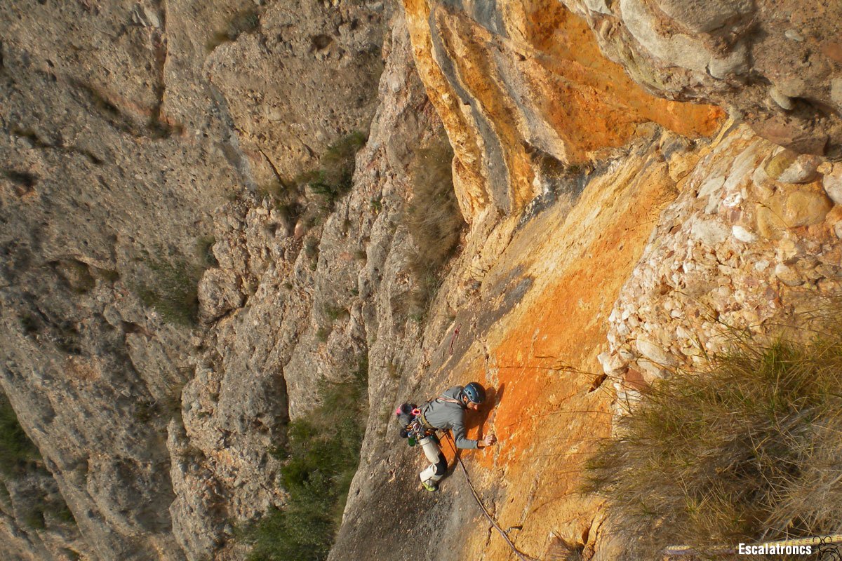 Ens enfilem per l’esperó, on de seguida podrem col·locar un Camalot #2. Continuem recte amunt per després obliquar cap a a l’esquerra seguint una fissura. La reunió la fem sota el sostre. 40 metres, 2 parabolts i 2 claus.