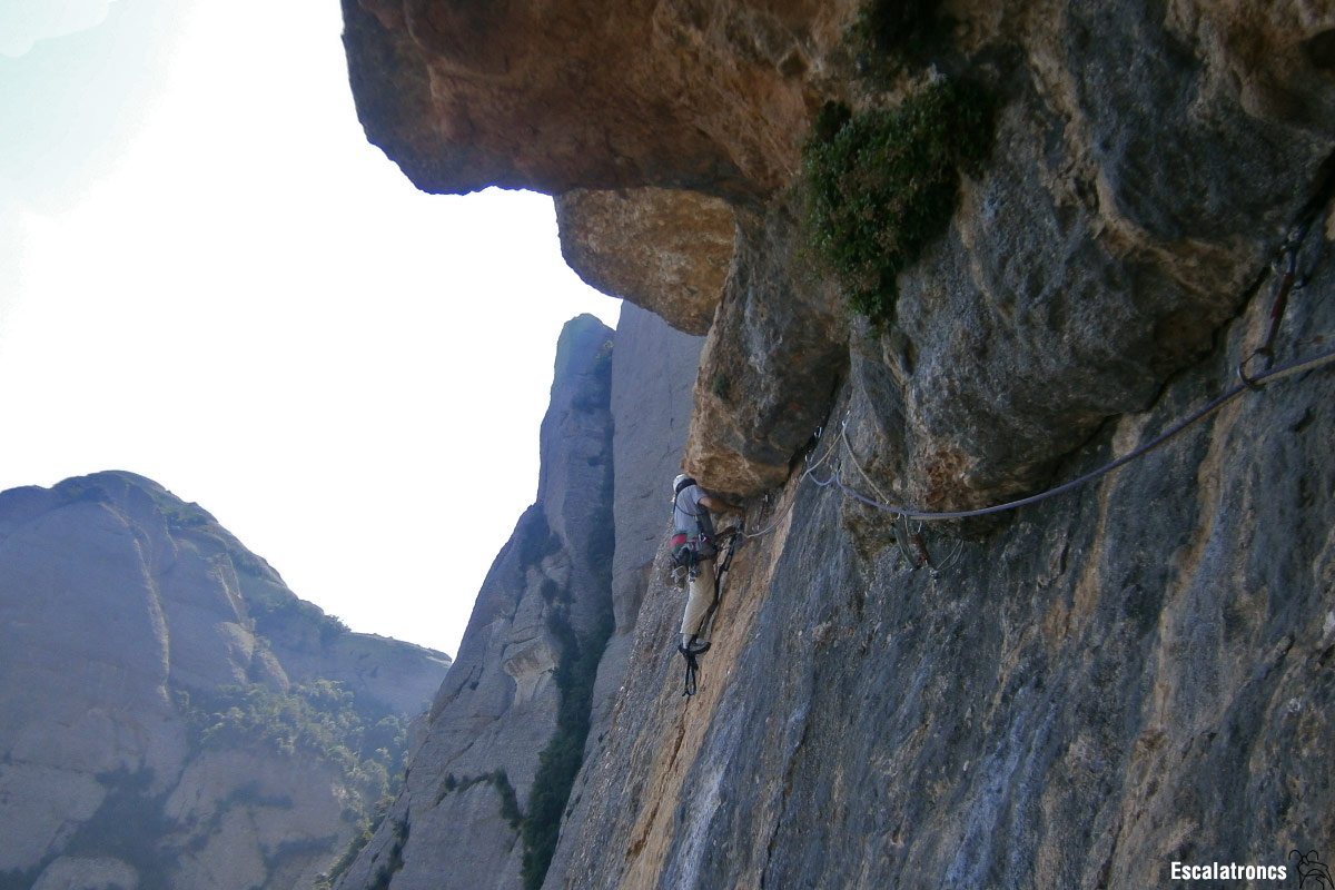 La via s’inicia a la base de l’evident sistema de sostres d’aquesta banda de la paret. Ataquem una llastra que superem en bavaresa per anar a buscar un diedre evident que escalem fins que ens toca sortir a la placa. Continuem diagonalment per la placa en una escalada que esdevé força singular per regletera. La reunió la muntem sobre una enorme savina. 45 metres.