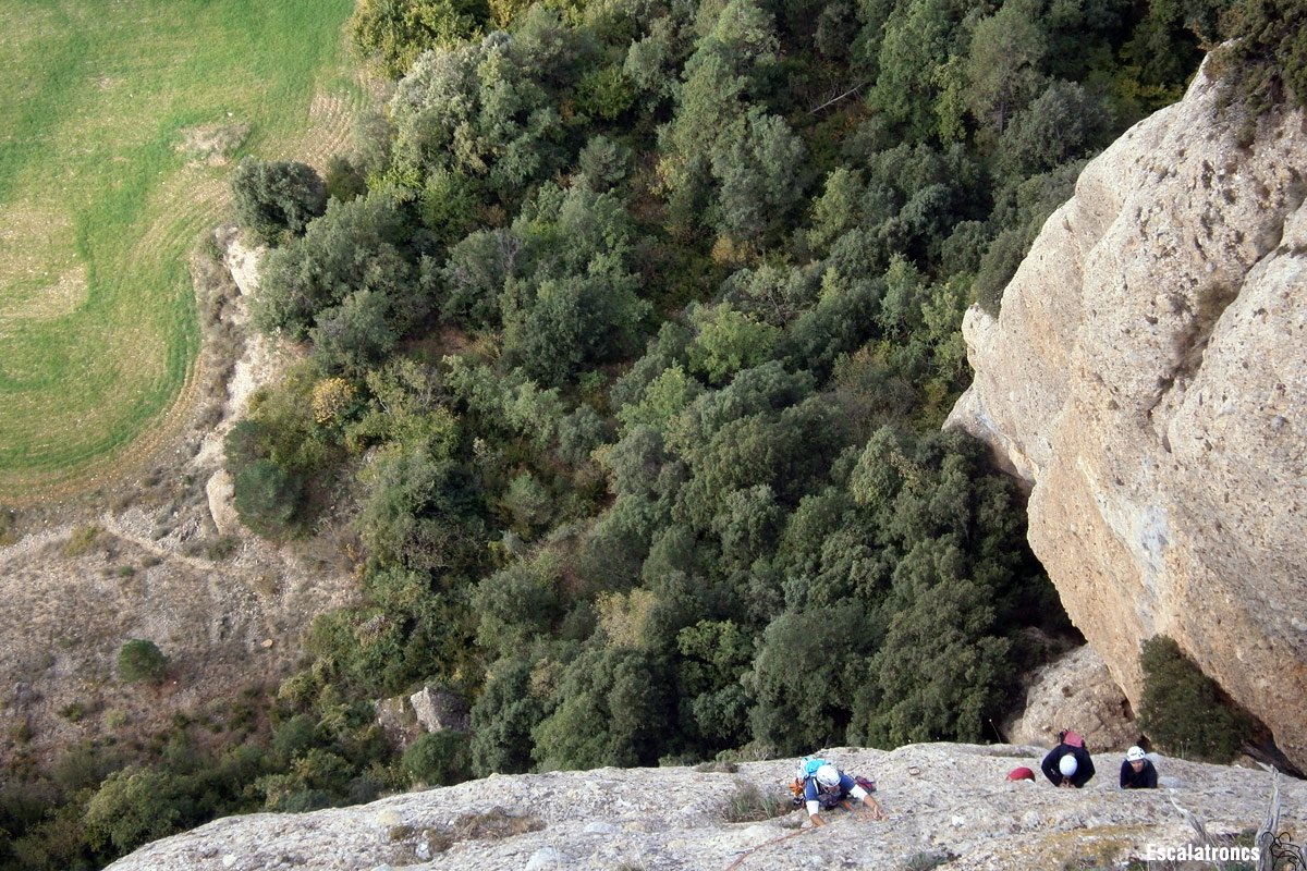 Sortida explosiva que ens deixa sobre una placa que de seguida es va ajaient. En aquest tram trobarem la roca lleugerament recoberta de liquens i a la part superior alguna roca solta. La reunió la fem a l’extrem esquerra d’una pintoresca balma. 35 metres.