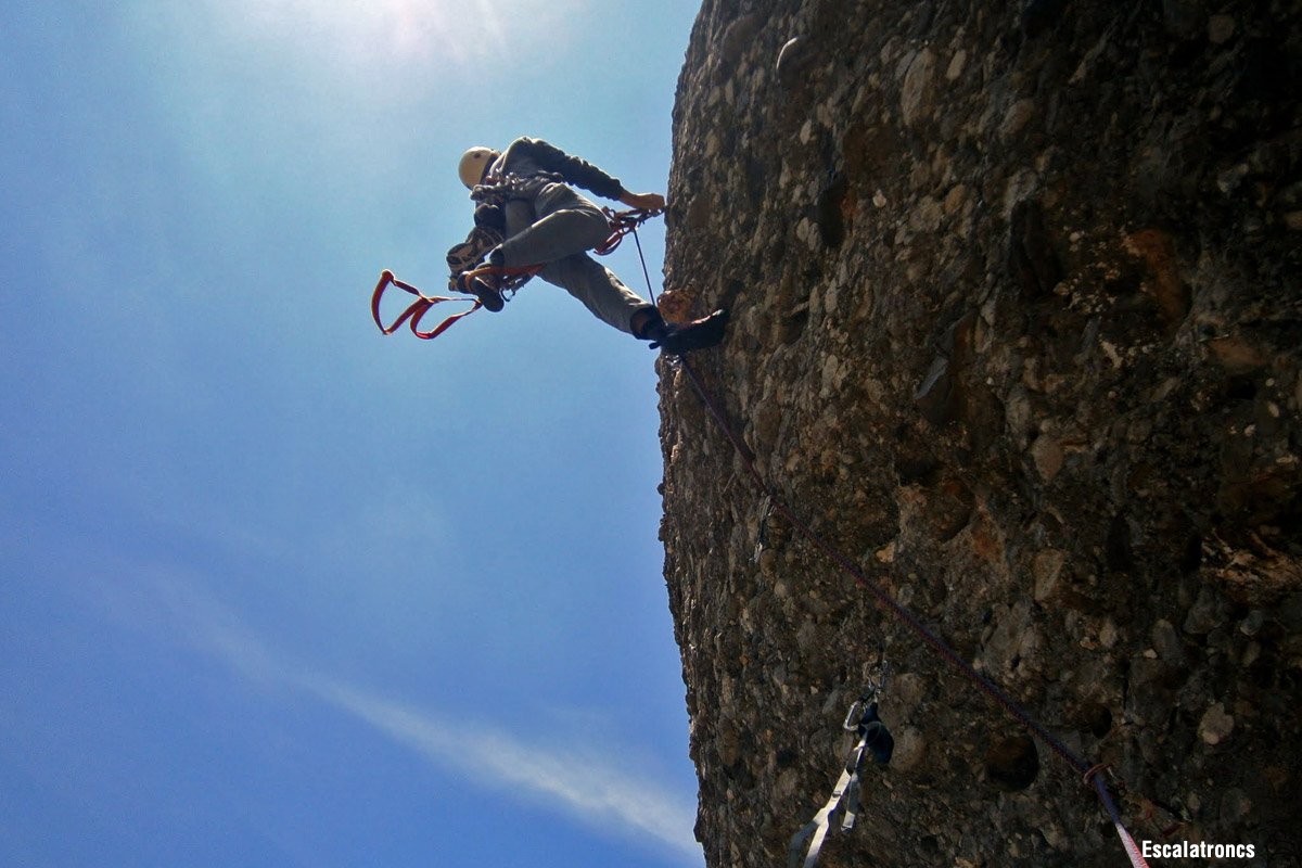 Curt ràpel pel vessant nord cap al coll amb la Prenyada o desgrimpada.
