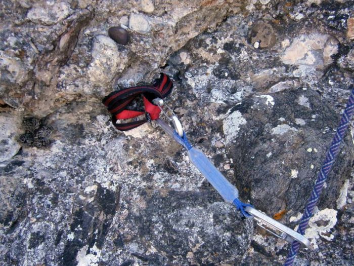 - Material: 8 cintes, 2 plaquetes recuperables, bagues per merlets, un estrep i algun tricam i micro-friend