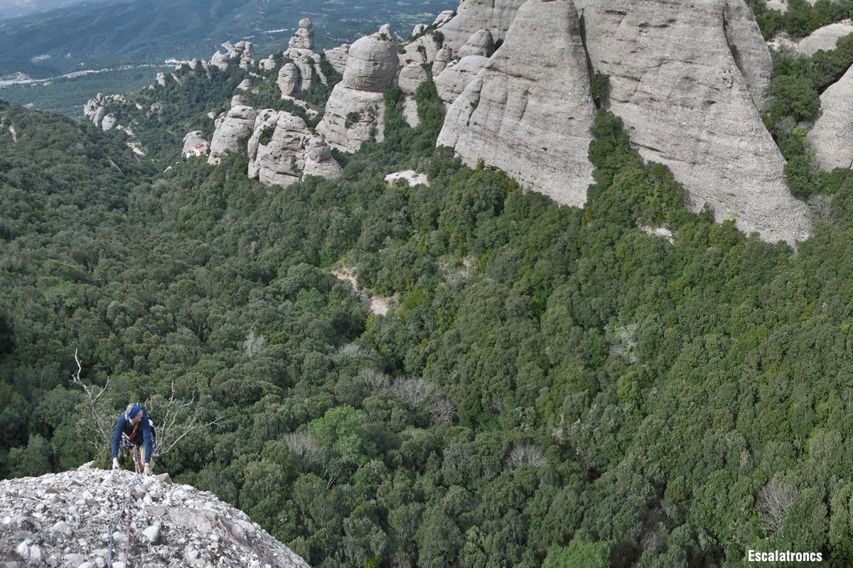 Desgrimpem uns metres pel vessant nord i anem a buscar una savina des d’on podrem fer un curt ràpel cap a l’est que ens deixa a la canal.