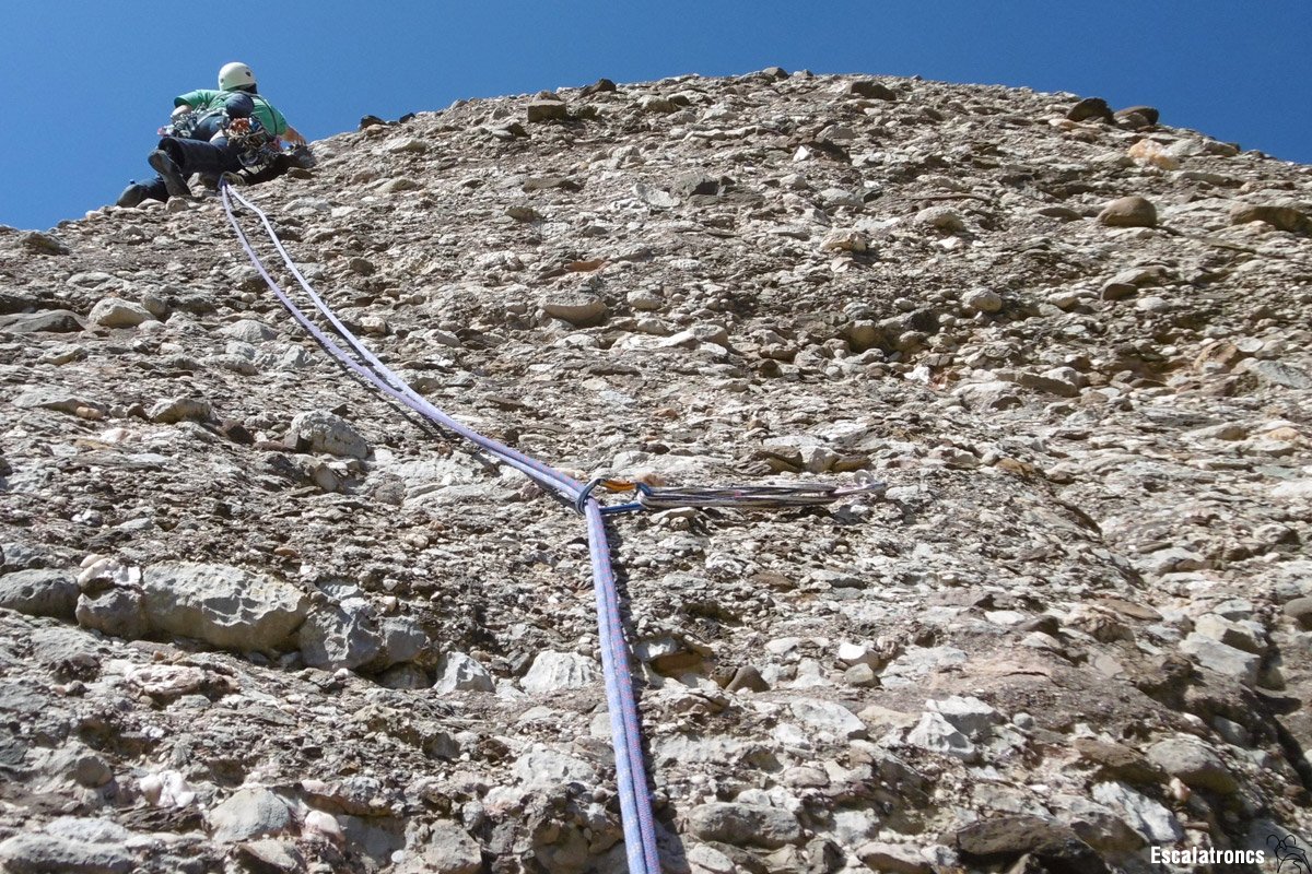Uns metres més avall del peu de via original trobem una filera de químics d’una via esportiva que podem aprofitar per enfilar la fissura. Un cop atenyem l’escletxa podrem protegir-nos amb algun tascó de mida mitjana. El segon llarg està reequipat amb parabolts del 8 (3); es tracta d’una tirada amb un grau d’exposició alt, on podrem llaçar un merlet bo entre la segona i la tercera expansió. En general la roca es bona, però al ser una via poc repetida encara van saltant coses.