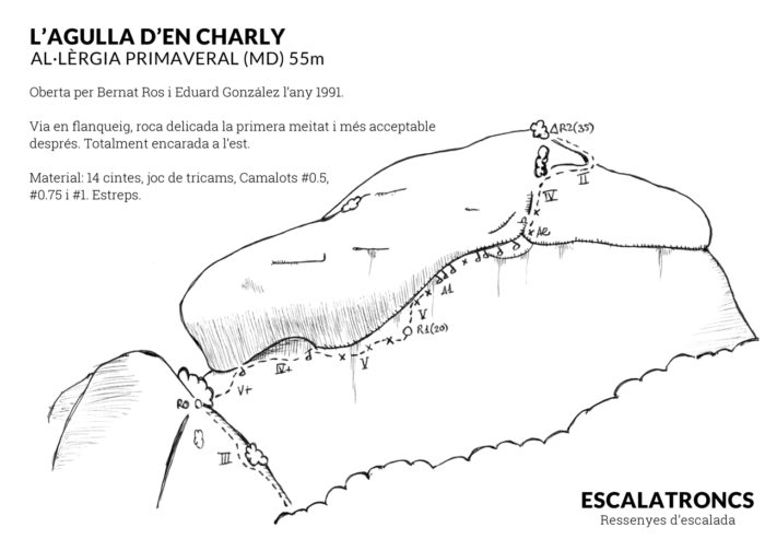 - Material: 14 cintes, joc de tricams, Camalots #0.5, #0.75 i #1. Estreps.