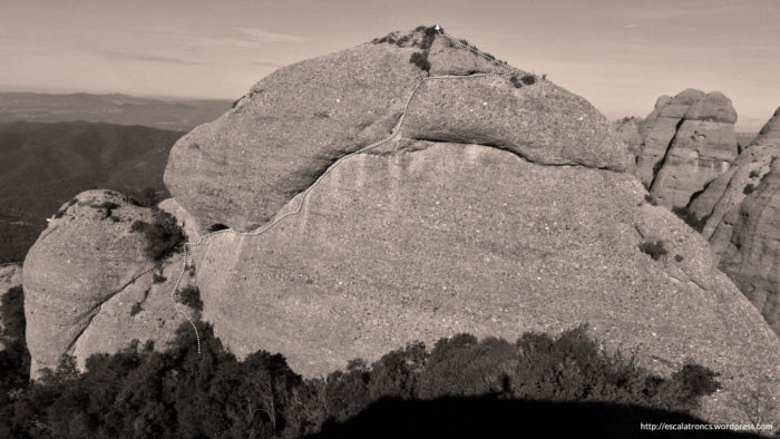 El peu de via és evident. Haurem de grimpar fins al coll on aprofitarem una alzina per muntar la R-0. Arribar al primer clau és el tram més compromès de la via, no és gens evident i la roca és poc fiable. La resta de la tirada és un flanqueig on tocarà anar pujant i baixant segons veiem; en tot el llarg la roca és bastant mediocre. La segona tirada surt recte amunt a anar a buscar la fissura. Es fa tota pràcticament en artificial, tenint que equipar algun pas. La reunió cimera la fem d’una savina.