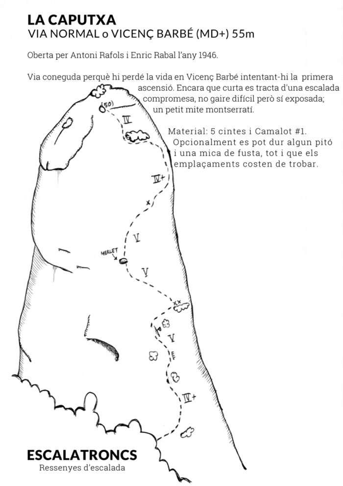 - Material: 5 cintes i Camalot #1. Opcionalment es pot dur algun clau variat i una mica de fusta, tot i que els emplaçaments costen de trobar.