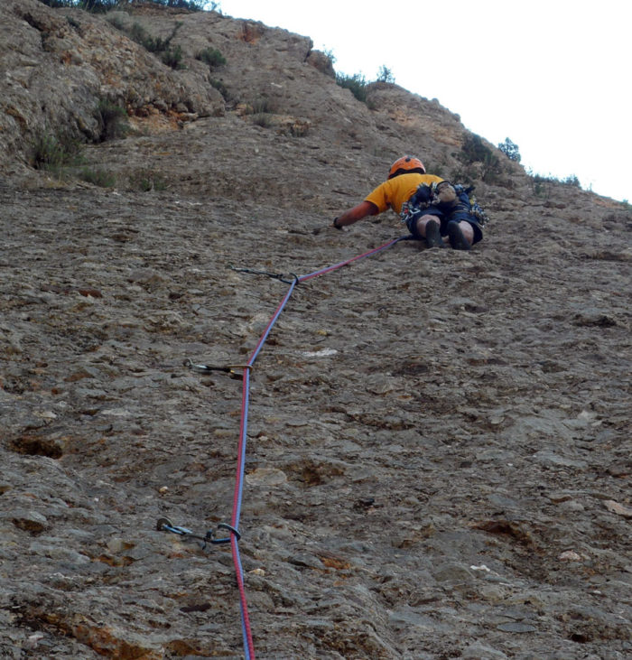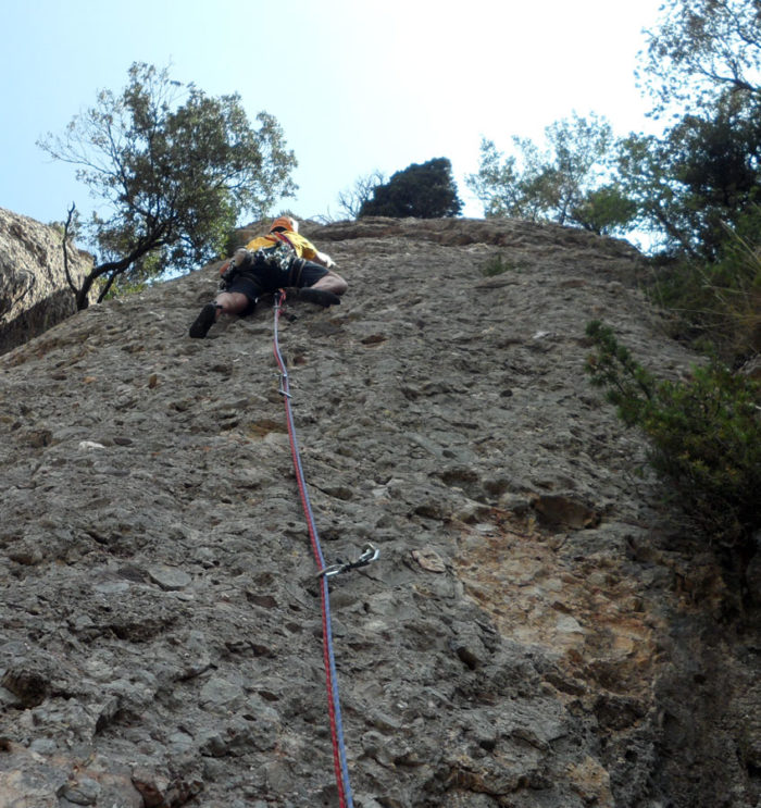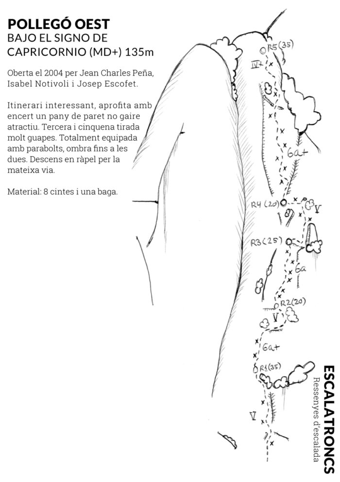 Hi destaquen les tirades tercera i cinquena, dos llargs de placa sobre roca excel·lent. Ideal per una matinal quan cerquem ombra.