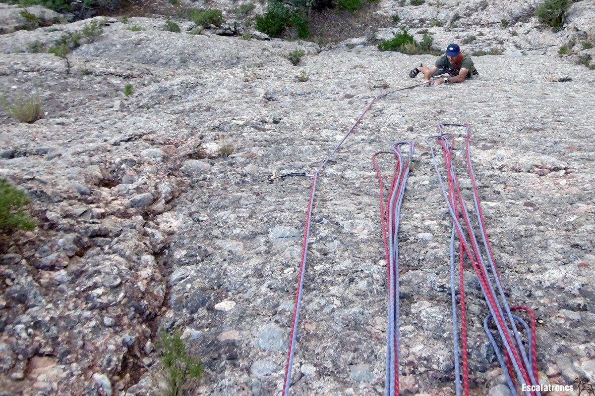 Un ràpel de 60 metres fins a la R-2 i d’allà un altre al terra. També es pot rapelar de reunió a reunió.