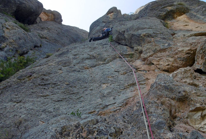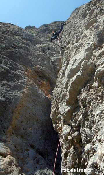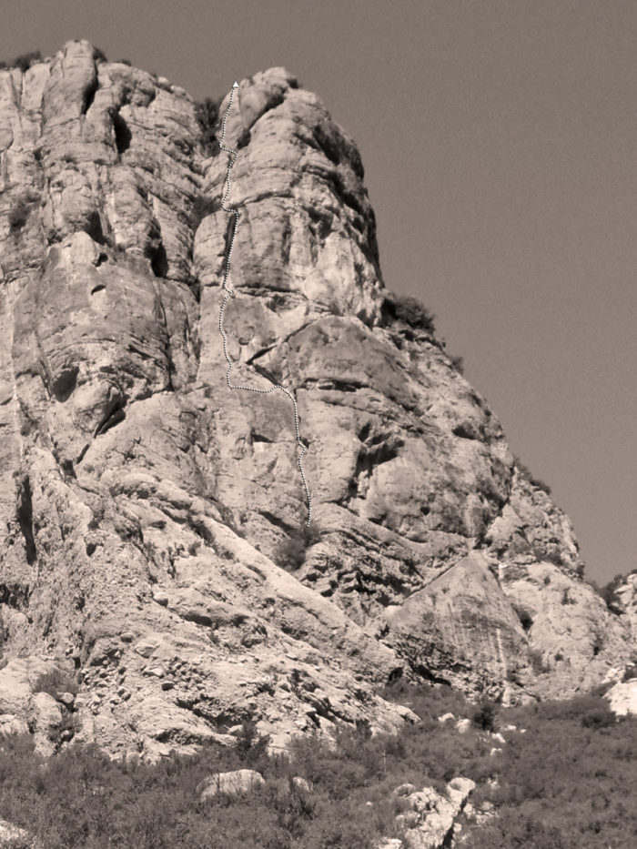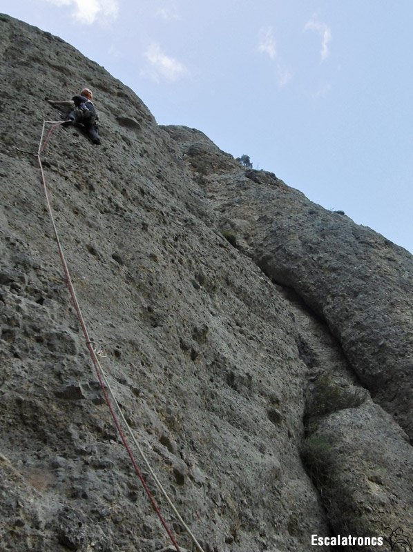 Itinerari bàsicament de fissures, això sí, de totes les mides. Hi destaquen el primer llarg, una xemeneia que de seguida s’estreta i ens obliga a sortir al buit;  el tercer, mantingut i amb uns passos de bavaresa genials; el quart, un diedre clàssic i el sisè, de placa i sobre un conglomerat excel·lent.