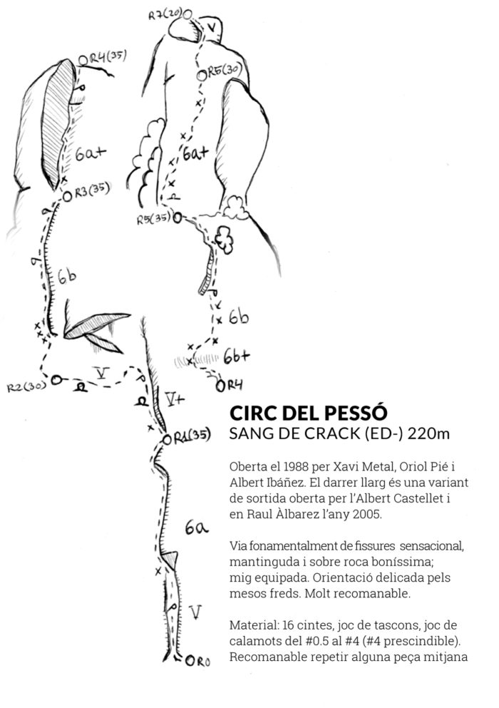 Sensacional escalada, mantinguda i vertical, la Sang de Crack ressegueix fil per randa un sistema de fissures a l’evident esperó de l’extrem nord del Circ del Pessó.