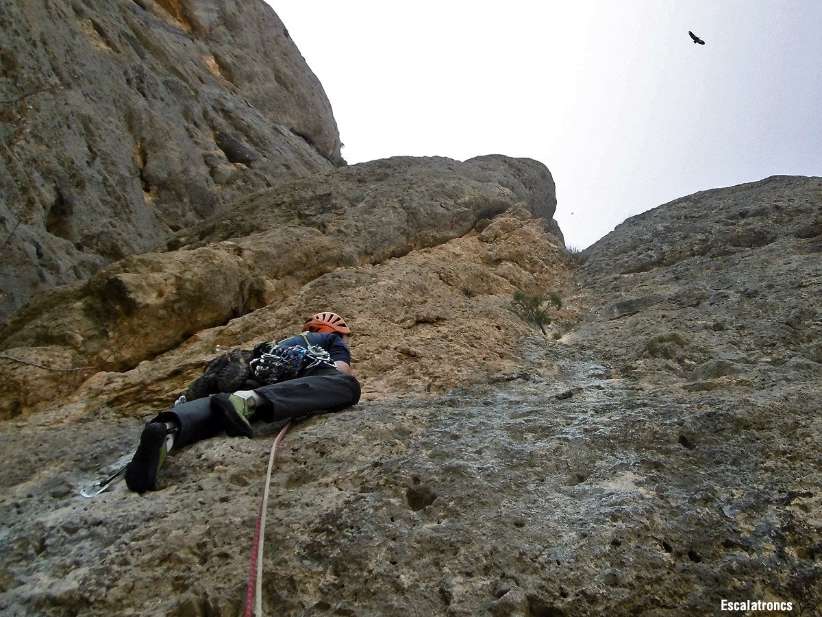 Totes les tirades són bones, i més si sortim per la variant d’en Castellet, un final de festa en placa que esdevé el colofó perfecte. La roca és singular, barreja de calcari i conglomerat, adherent i farcida de relleus i forats que faciliten la progressió. I tot plegat en un entorn altiu on es sent l’alè del Pirineu proper mentre els voltors observen complaents.