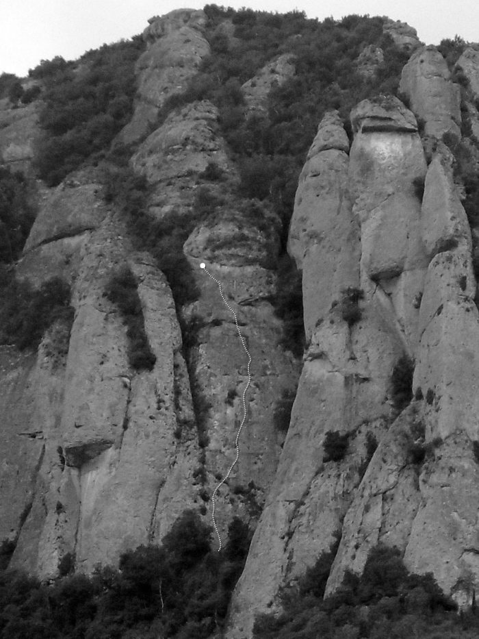 La via consta de dos tirades, la primera mantinguda en V i amb un rocam millor del que aparenta. La segona té a mig llarg una panxa (no obligada) que li dóna el grau. Ombra a partir de les 3 de la tarda.