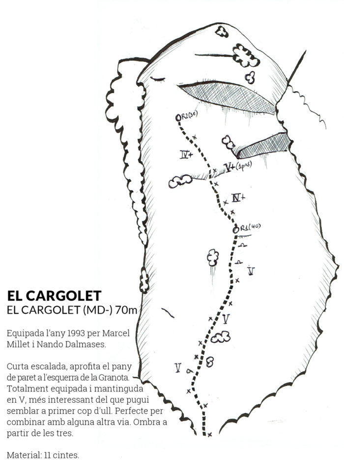 Més interessant del que pugui semblar a priori el Cargolet esdevé un bon complement per arrodonir el dia si escalem a la Granota. Totalment equipada, bona roca i un agradable V grau de cap a peus en són les credencials.