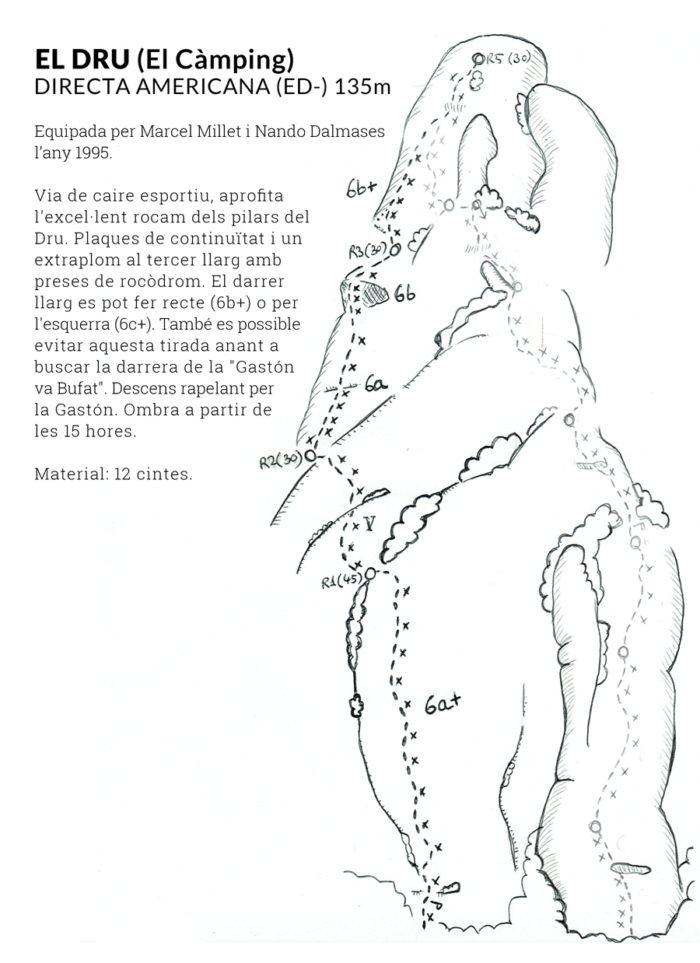 La Directa Americana cerca el camí per enfilar-se al capdamunt de l’Esperó del Dru (res a veure amb el seu homònim Alpí). Ho fa aprofitant unes plaques en general verticals i de gran qualitat.