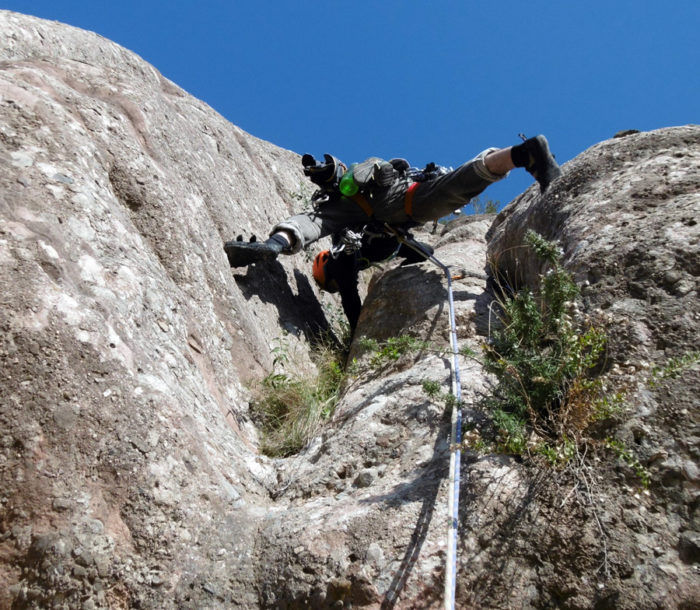 Des de la darrera reunió fem un primer ràpel a la R-9 i d’aquesta a la 7. Des de la R-7 fem un darrer ràpel fins la feixa i la resseguim direcció oest fins a la gran canal. Anem en tendència oest fins trobar unes cordes fixes i d’allí fins a les Coves del Salnitre.