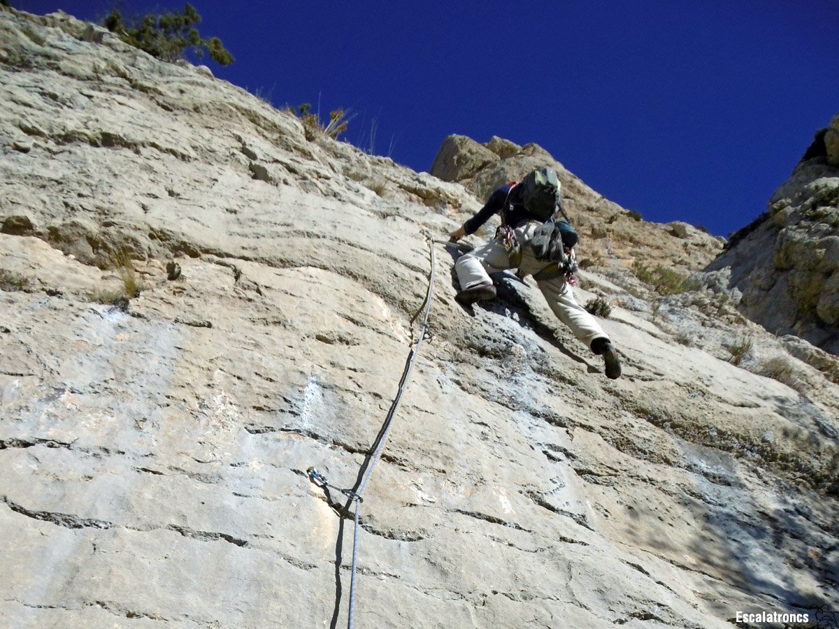 Una via semi-equipada, amb bona roca, ràpida i amb alguna feixa que li treu ambient però no empenta.
