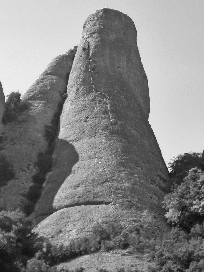 La darrera tirada ressegueix el diedre que fa la llastra característica d’aquesta part del monòlit. Un cop enfilats al damunt atacarem el darrer tram, una placa molt vertical on trobarem un burí i dos espits.
