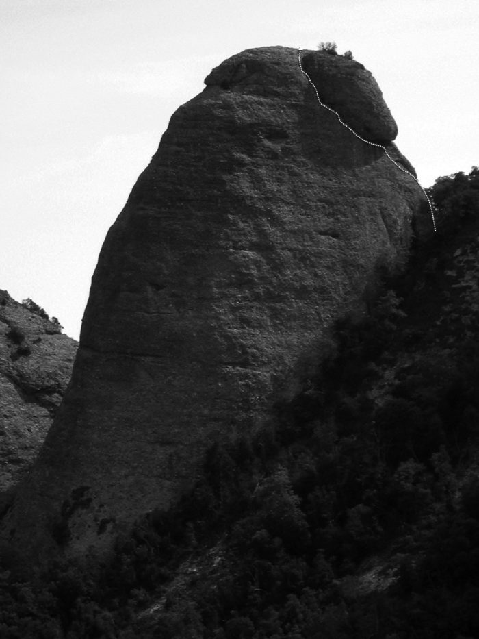 La línia és d’una evidència contundent, flanqueja per sota el sostre fins que pot superar-lo per la seva esquerra i sortir al cim. El flanqueig és bonic, amb roca prou sòlida, el tram clau el trobarem al darrer terç de la tirada amb una secció que demana treballar bé els peus. No obstant aquesta tirada està super-equipada i tot el que passi de IV+ es pot fer en A0.