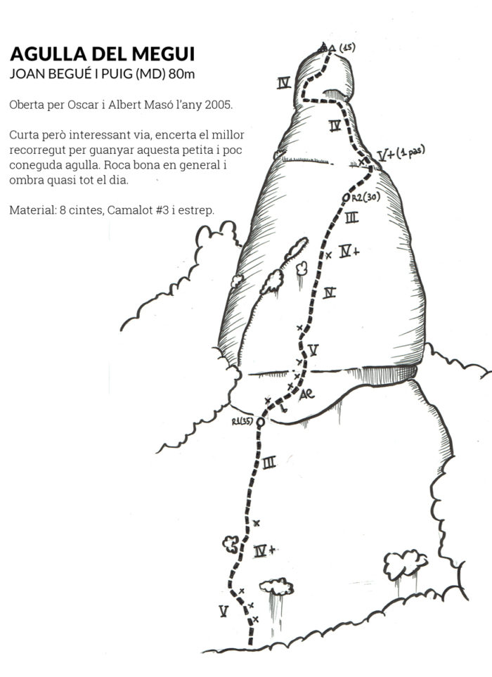 Pràcticament equipada es fa bé amb el que hi ha posat. Només haurem de menester un friend més aviat gran per protegir els darrers metres de la via que tot i ser fàcils presenten roca trencadissa.